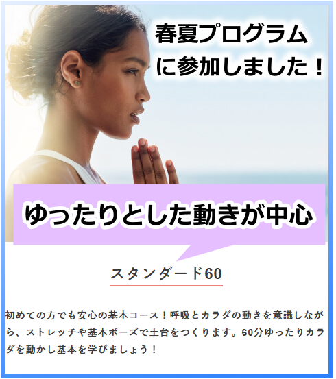 | スタンダード60 | ヨガの基礎を学べる初心者向け。呼吸に合わせてゆっくりカラダを動かすので、基本ポーズの習得や復習ができる。 |